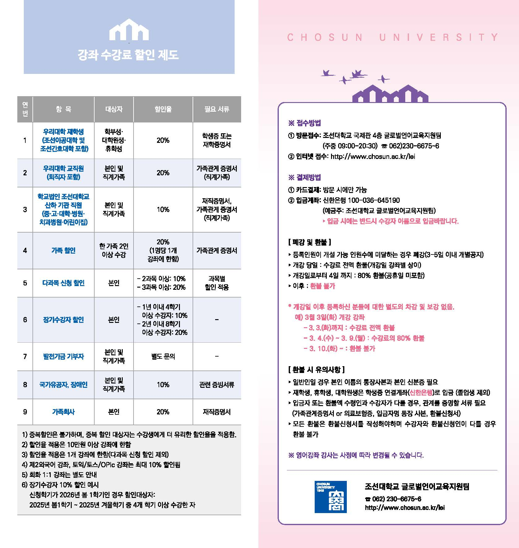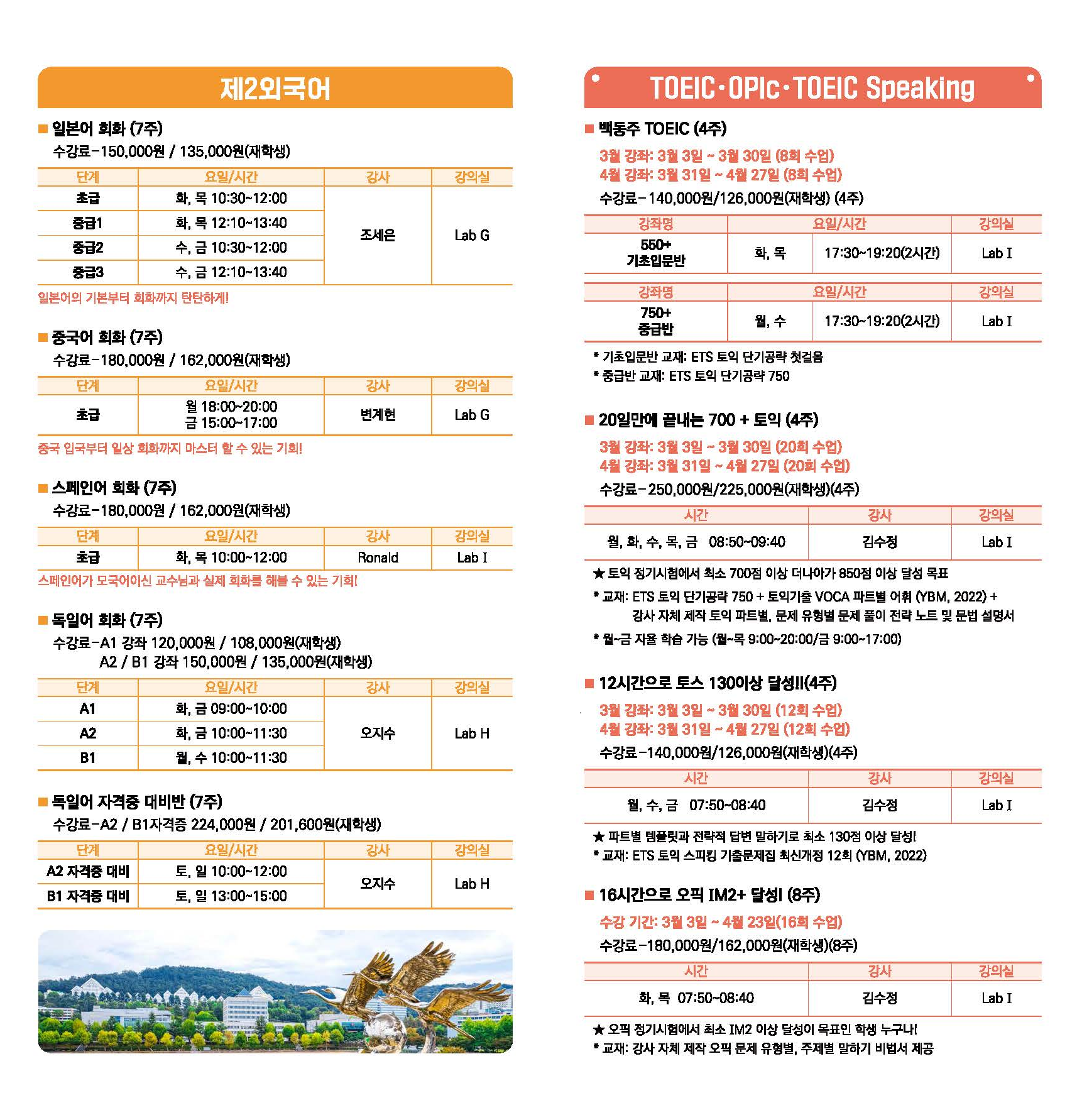26학년도 봄1학기 외국어 강좌 개강(2월 19일부터 선착순 접수+레벨테스트 공지)