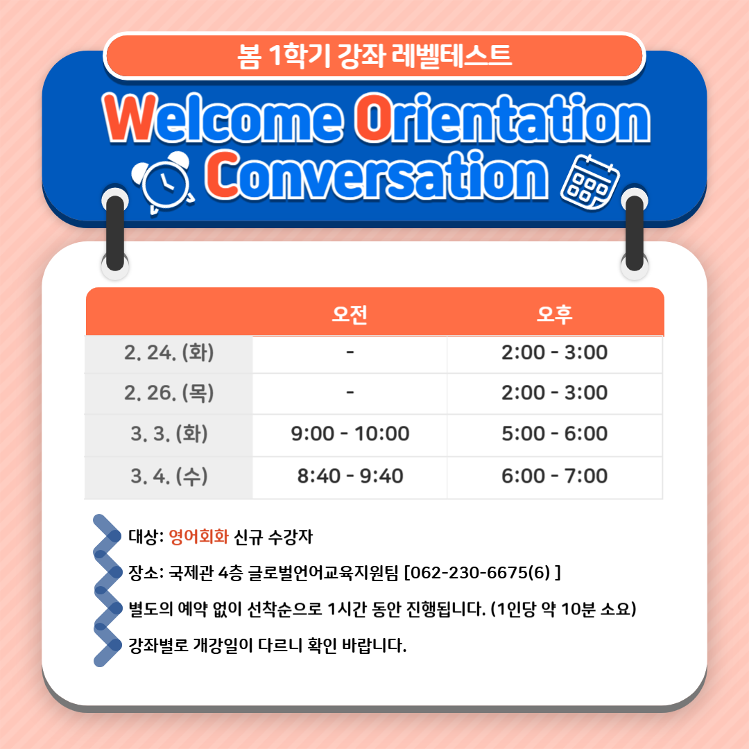 * 레벨테스트는 쓰기, 듣기, 읽기 3파트(약 7~10분)로 이루어지며 테스트 당일 선착순으로 진행됩니다.