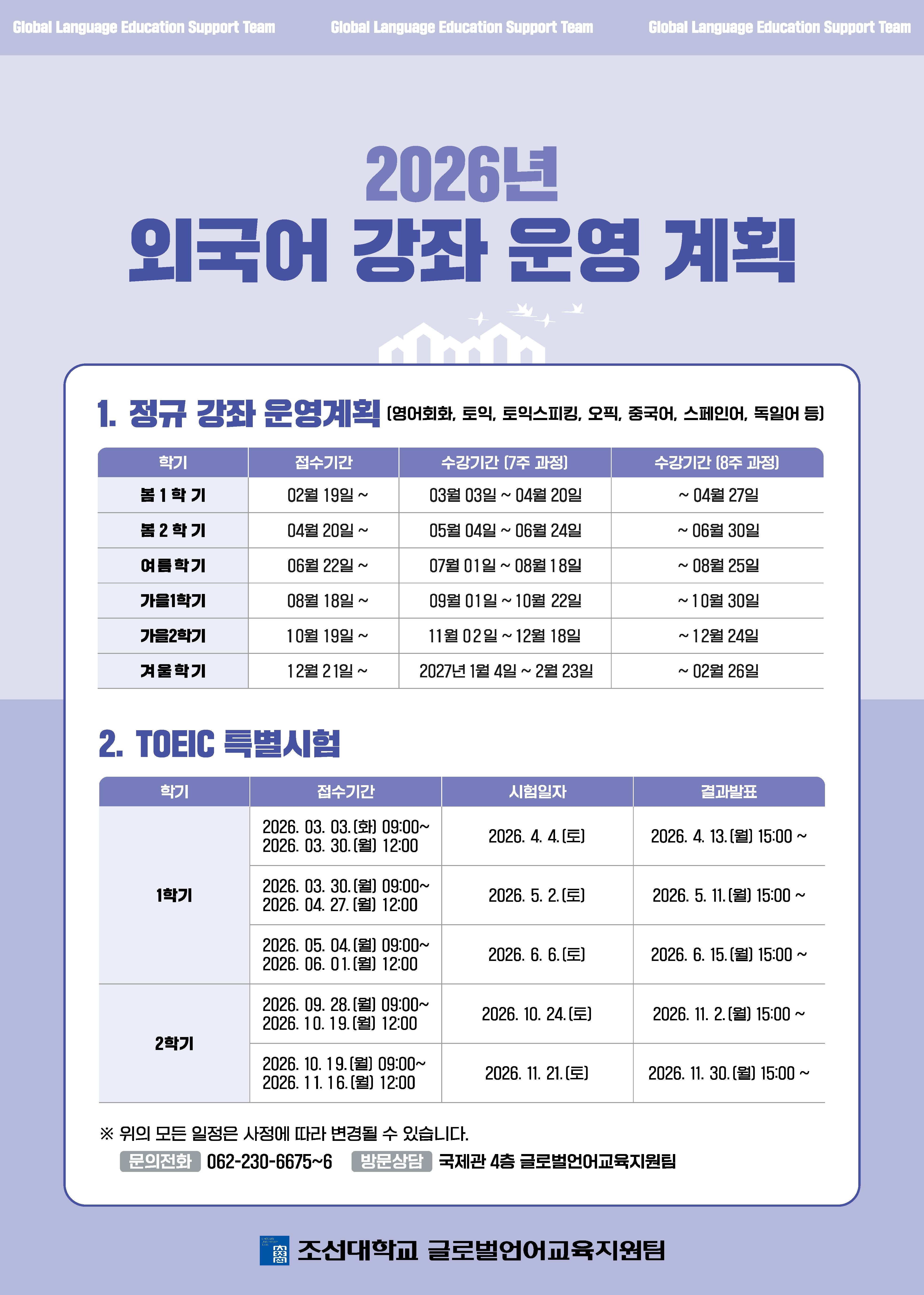 fnctId=bbs,fnctNo=333 글번호 229664 2026학년도 외국어 강좌 및 TOEIC 특별시험 운영 계획 작성일 2026.02.24 수정일 2026.02.24 작성자 글로벌언어교육지원팀 조회수 941 첨부파일 26학년도 운영 계획.pdf